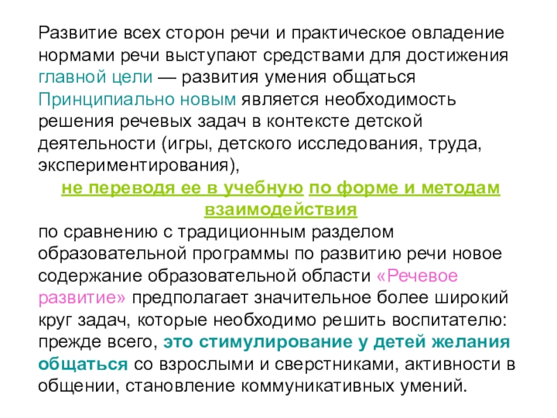 по сравнению с традиционным разделом образовательной программы по развитию речи новое содержание образовательной области «Речевое развитие» предполагает значительное более широкий круг задач, которые необходимо решить воспитателю: прежде всего, это стимулирование у детей желания общаться со взрослыми и сверстниками, активности в общении, становление коммуникативных умений.