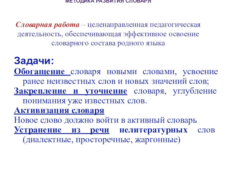 Словарная работа – целенаправленная педагогическая деятельность, обеспечивающая эффективное освоение