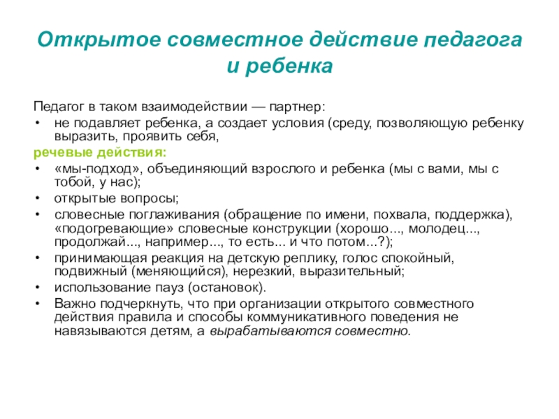 Важно подчеркнуть, что при организации открытого совместного действия правила и способы коммуникативного поведения не навязываются детям, а вырабатываются совместно.