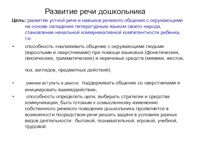 способность определять цели, выбирать стратегии и средства коммуникации, быть готовым к осмысленному изменению собственного речевого поведения дошкольника проявляется в возможности посредством речи решать задачи в условиях разных видов деятельности: бытовой, познавательной, игровой, учебной, трудовой.