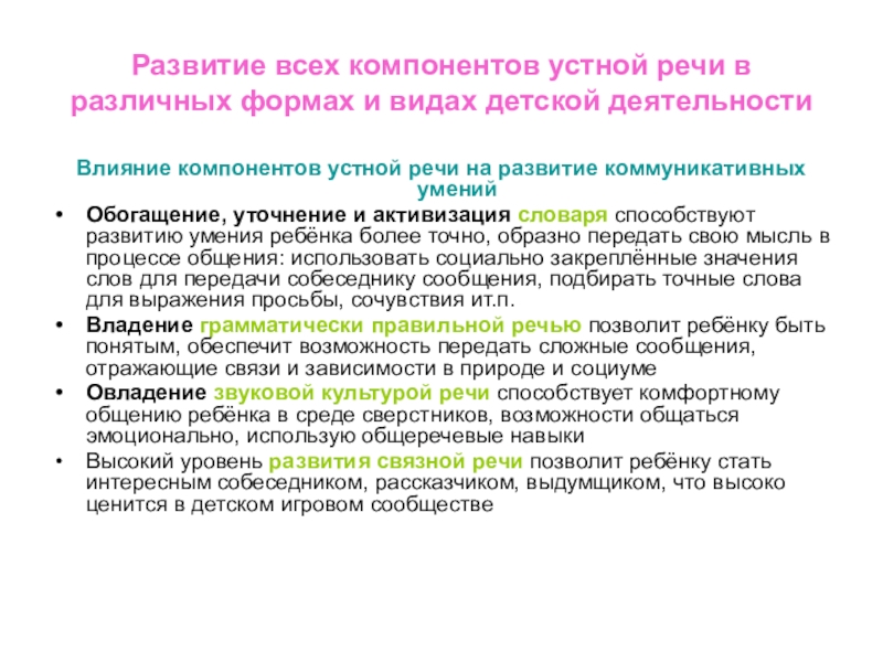 Слайд 9Развитие всех компонентов устной речи в различных формах и видах детской