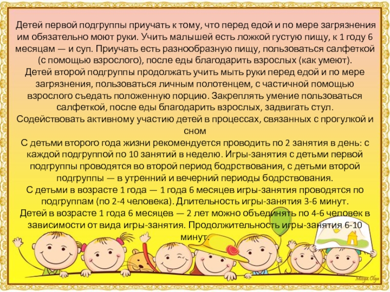 Слайд 7Детей первой подгруппы приучать к тому, что перед едой и по