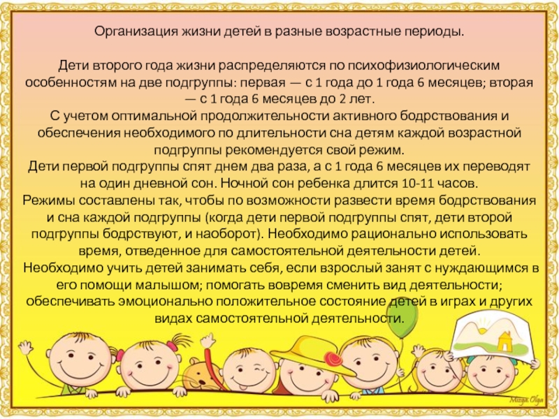 Слайд 5Организация жизни детей в разные возрастные периоды.
