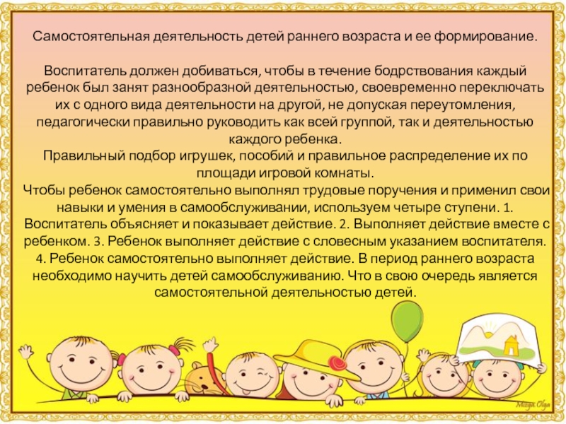 Чтобы ребенок самостоятельно выполнял трудовые поручения и применил свои навыки и умения в самообслуживании, используем четыре ступени. 1. Воспитатель объясняет и показывает действие. 2. Выполняет действие вместе с ребенком. 3. Ребенок выполняет действие с словесным указанием воспитателя. 4. Ребенок самостоятельно выполняет действие. В период раннего возраста необходимо научить детей самообслуживанию. Что в свою очередь является самостоятельной деятельностью детей.