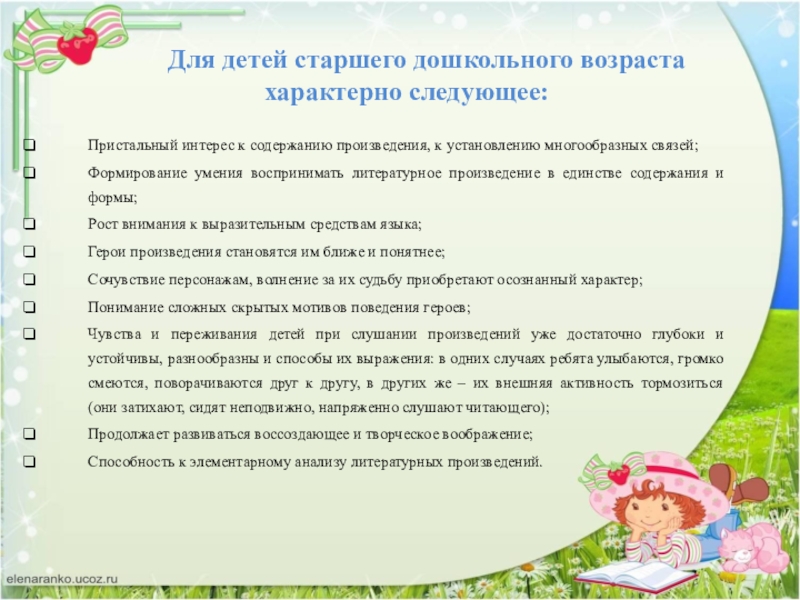Для детей старшего дошкольного возраста характерно следующее:Пристальный интерес к содержанию произведения, к установлению многообразных связей; Формирование умения воспринимать литературное произведение в единстве содержания и формы; Рост внимания к выразительным средствам языка; Герои произведения становятся им ближе