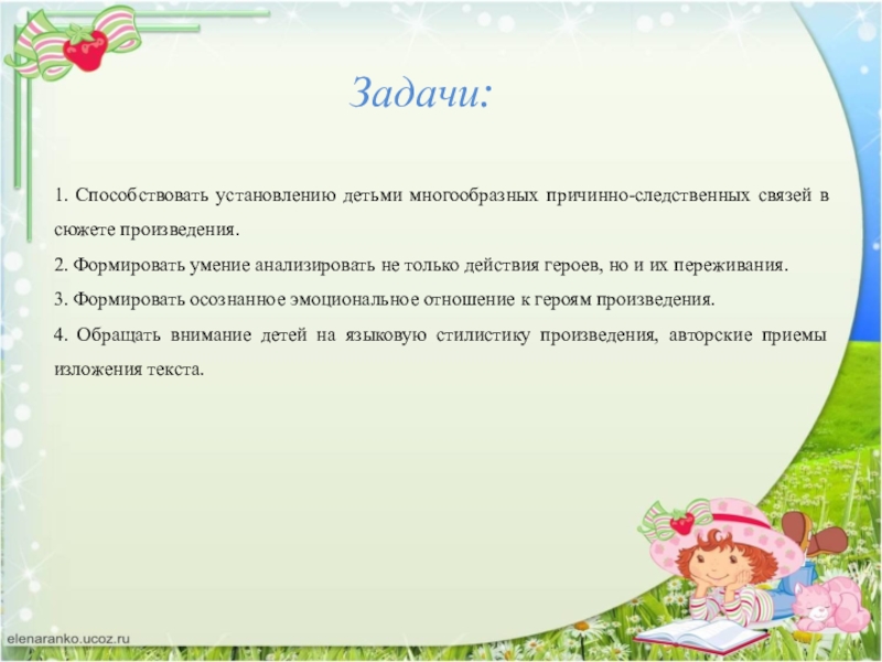 Задачи:1. Способствовать установлению детьми многообразных причинно-следственных связей в сюжете произведения.2. Формировать умение анализировать не только действия героев,
