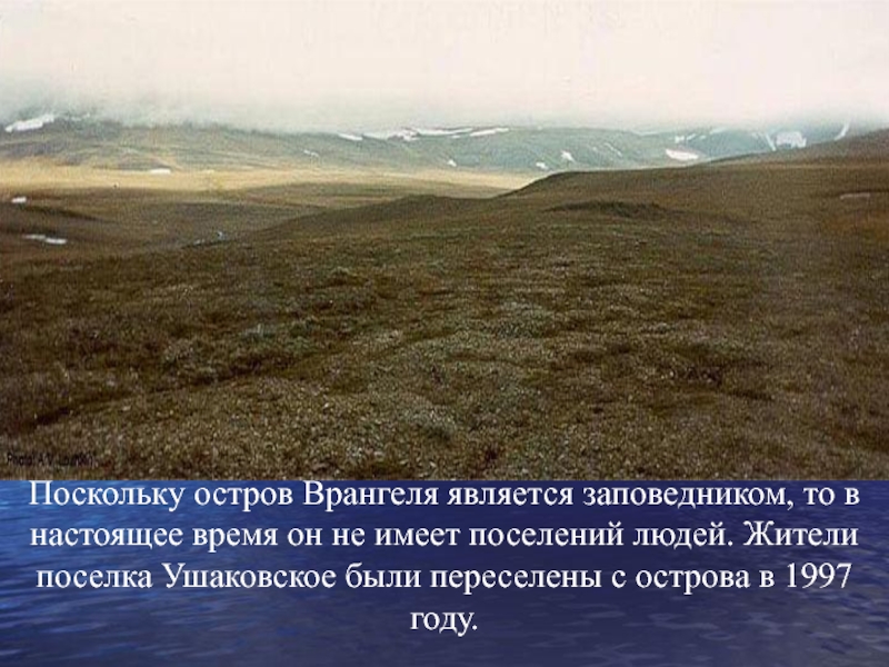 Поскольку остров Врангеля является заповедником, то в настоящее время он не имеет поселений людей. Жители поселка Ушаковское были переселены с острова в 1997 году.
