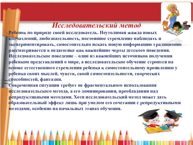 Современная ситуация требует не фрагментального использования исследовательского метода, а его доминирования, преобладания над репродуктивными методами. Хотя исследовательский метод может дать образовательный эффект лишь при умелом его сочетании с репродуктивными методами, особенно на начальных этапах обучения.