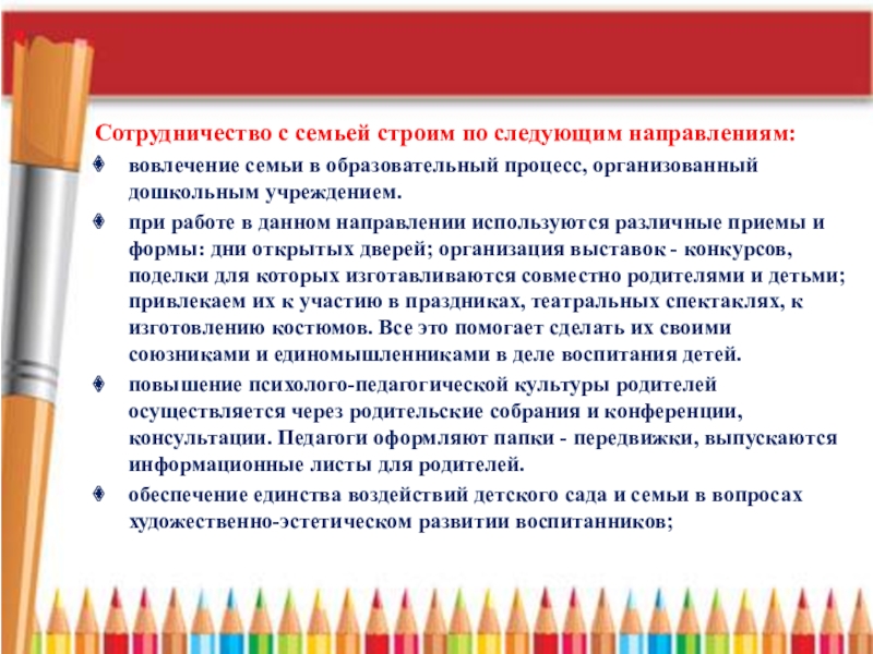 Слайд 18Сотрудничество с семьей строим по следующим направлениям: