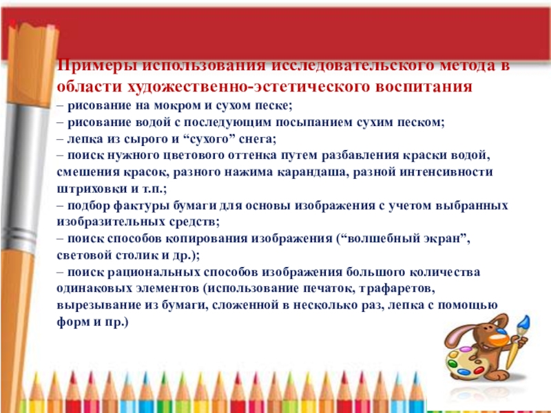 Слайд 11Примеры использования исследовательского метода в области художественно-эстетического воспитания
