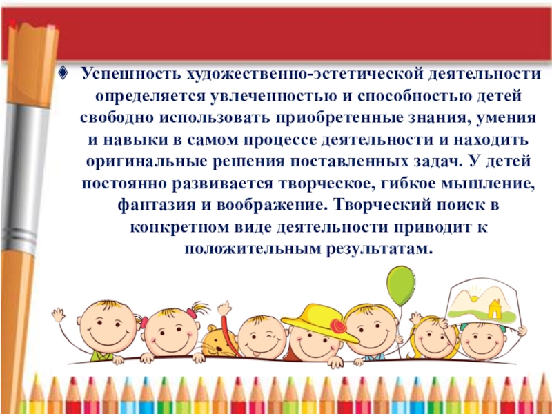 Слайд 20Успешность художественно-эстетической деятельности определяется увлеченностью и способностью детей свободно использовать приобретенные