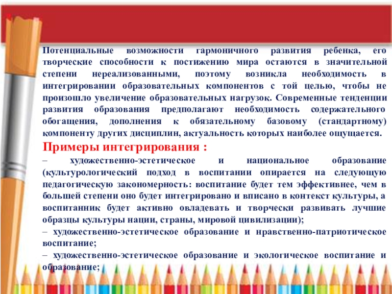 – художественно-эстетическое и национальное образование (культурологический подход в воспитании опирается на следующую педагогическую закономерность: воспитание будет тем эффективнее, чем в большей степени оно будет интегрировано и вписано в контекст культуры, а воспитанник будет активно овладевать и творчески развивать лучшие образцы культуры нации, страны, мировой цивилизации);