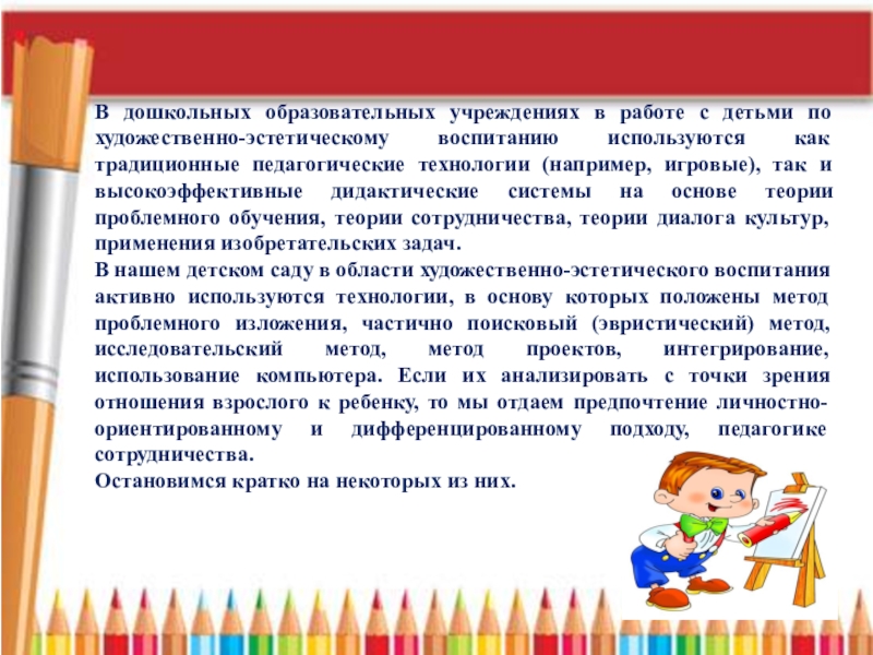 В нашем детском саду в области художественно-эстетического воспитания активно используются технологии, в основу которых положены метод проблемного изложения, частично поисковый (эвристический) метод, исследовательский метод, метод проектов, интегрирование, использование компьютера. Если их анализировать с точки зрения отношения взрослого к ребенку, то мы отдаем предпочтение личностно-ориентированному и дифференцированному подходу, педагогике сотрудничества.