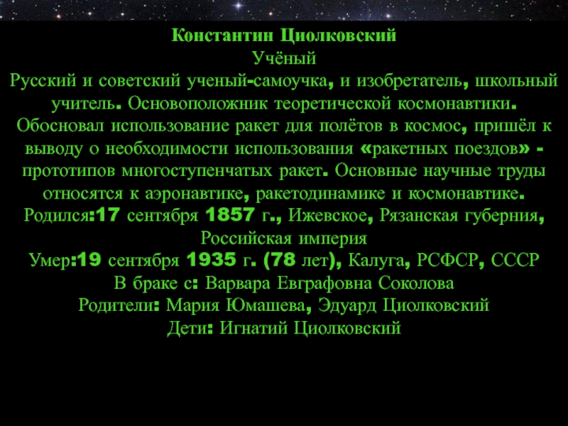 космонавтики. Обосновал использование ракет для полётов в космос, пришёл к выводу о необходимости использования «ракетных поездов» - прототипов многоступенчатых ракет. Основные научные труды относятся к аэронавтике, ракетодинамике и космонавтике. Родился:17 сентября 1857 г., Ижевское, Рязанская губерния, Российская империя
