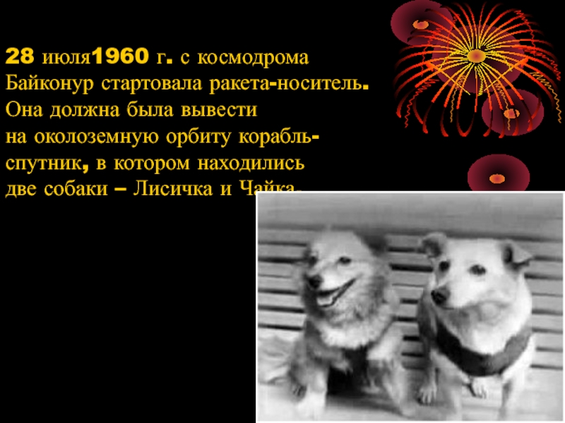Слайд 1228 июля1960 г. с космодрома Байконур стартовала ракета-носитель. Она должна была вывести на околоземную орбиту