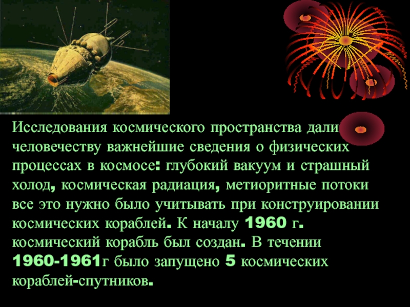 космосе: глубокий вакуум и страшный холод, космическая радиация, метиоритные потоки все это нужно было учитывать при конструировании космических кораблей. К началу 1960 г. космический корабль был создан. В течении 1960-1961г было запущено 5 космических кораблей-спутников.