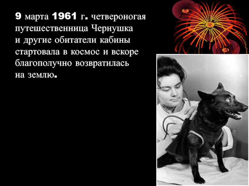 Слайд 159 марта 1961 г. четвероногая путешественница Чернушка и другие обитатели кабины стартовала в космос
