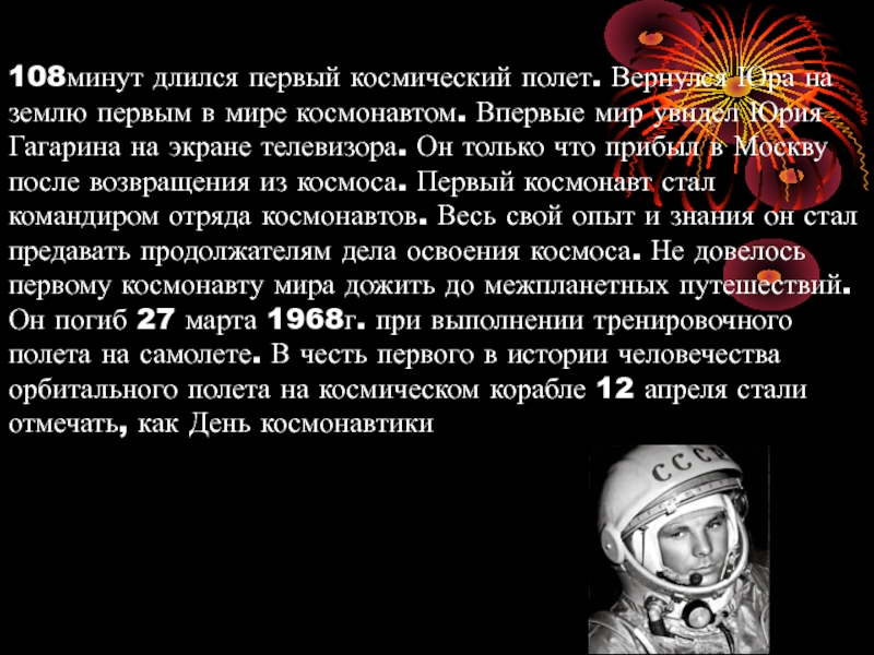 мире космонавтом. Впервые мир увидел Юрия Гагарина на экране телевизора. Он только что прибыл в Москву после возвращения из космоса. Первый космонавт стал командиром отряда космонавтов. Весь свой опыт и знания он стал предавать продолжателям дела освоения космоса. Не довелось первому космонавту мира дожить до межпланетных путешествий. Он погиб 27 марта 1968г. при выполнении тренировочного полета на самолете. В честь первого в истории человечества орбитального полета на космическом корабле 12 апреля стали отмечать, как День космонавтики