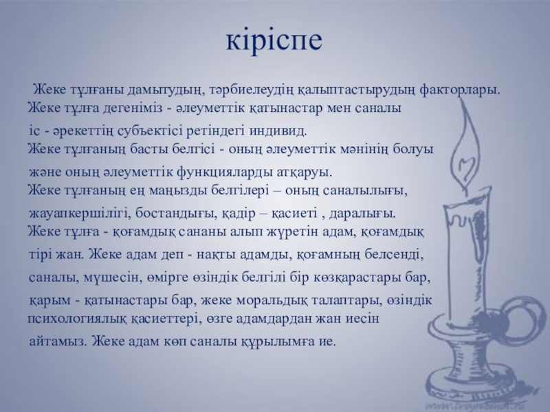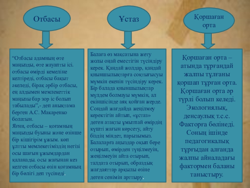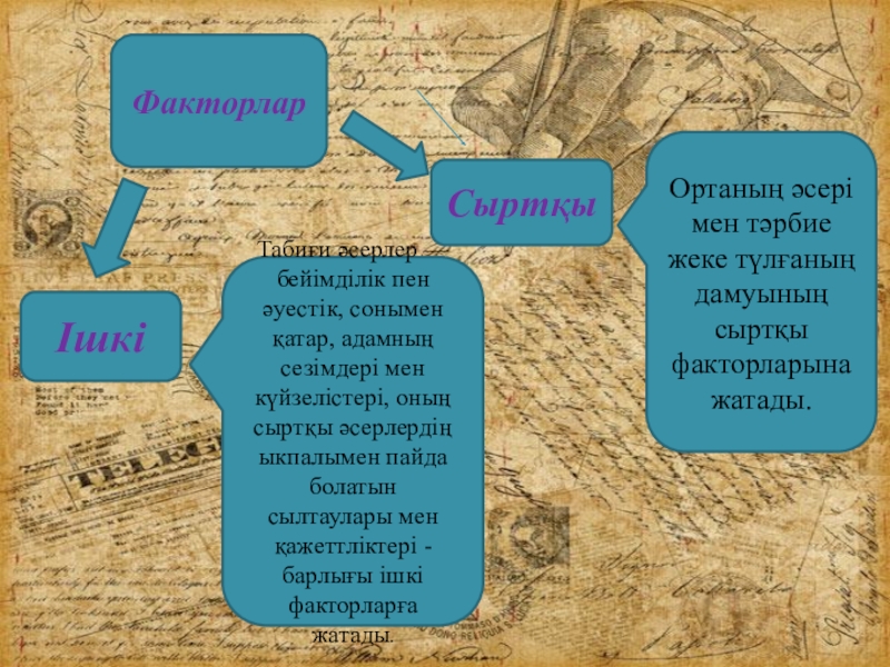 Ортаның әсері мен тәрбие жеке түлғаның дамуының сыртқы факторларына жатады.