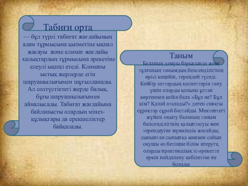 Қоршаған орта – атында тұрғандай жалпы тұлғаны қоршап тұрған орта. Қоршаған орта әр түрлі болып келеді. Экологиялық, денсаулық т.с.с. Факторға бөлінеді. Соның ішінде педагогикалық тұрғыдан алғанда жалпы айналадағы фактормен баланы таныстыру.