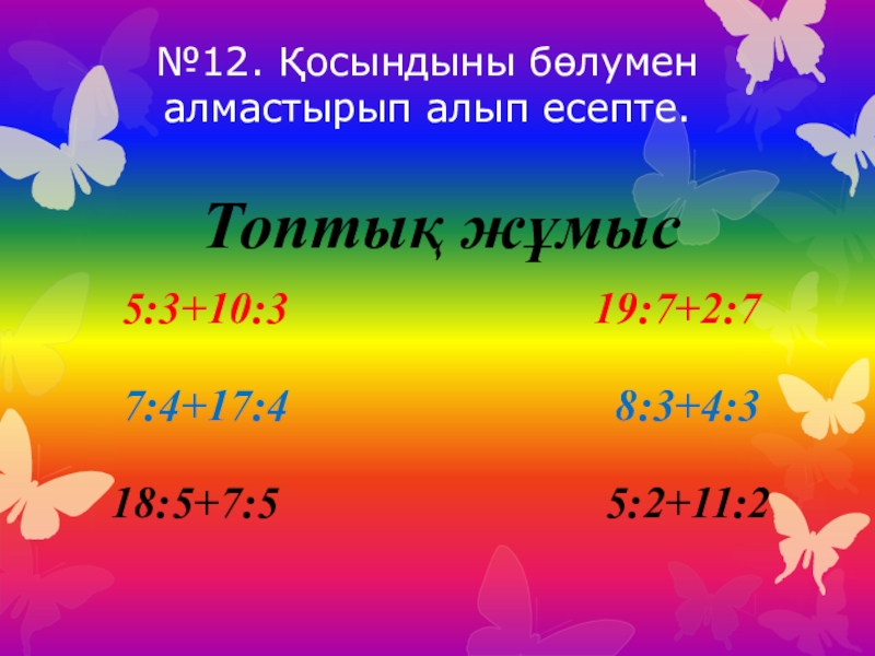 №12. Қосындыны бөлумен алмастырып алып есепте.Топтық жұмыс5:3+10:3