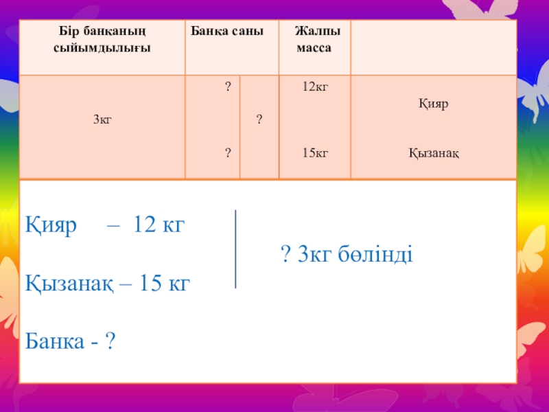 ? 3кг бөлінді Қызанақ – 15 кг Банка - ?