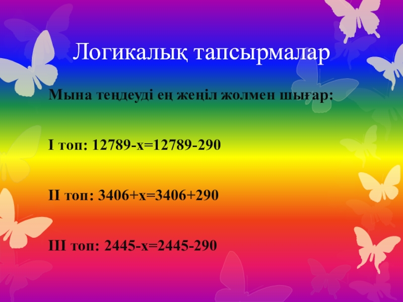 Логикалық тапсырмаларМына теңдеуді ең жеңіл жолмен шығар:І топ: 12789-х=12789-290ІІ топ: 3406+х=3406+290ІІІ топ: 2445-х=2445-290