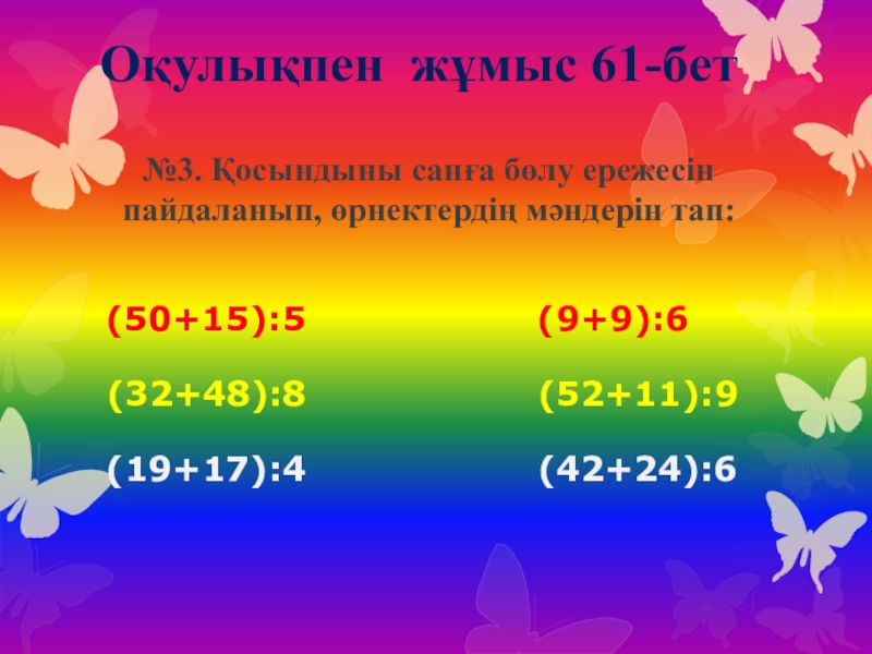 Оқулықпен жұмыс 61-бет№3. Қосындыны санға бөлу ережесін пайдаланып, өрнектердің мәндерін тап:	  (50+15):5