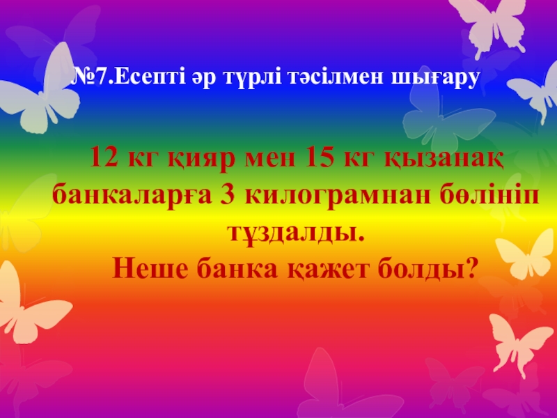 №7.Есепті әр түрлі тәсілмен шығару12 кг қияр мен 15 кг қызанақ банкаларға 3 килограмнан бөлініп тұздалды. Неше