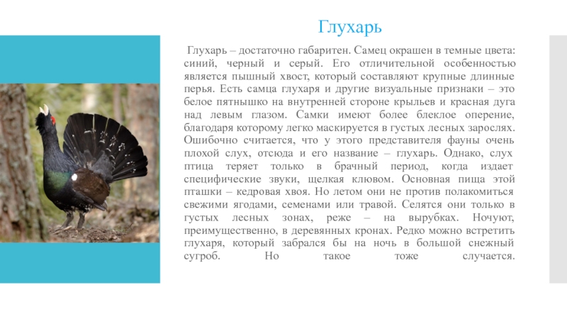 черный и серый. Его отличительной особенностью является пышный хвост, который составляют крупные длинные перья. Есть самца глухаря и другие визуальные признаки – это белое пятнышко на внутренней стороне крыльев и красная дуга над левым глазом. Самки имеют более блеклое оперение, благодаря которому легко маскируется в густых лесных зарослях. Ошибочно считается, что у этого представителя фауны очень плохой слух, отсюда и его название – глухарь. Однако, слух птица теряет только в брачный период, когда издает специфические звуки, щелкая клювом. Основная пища этой пташки – кедровая хвоя. Но летом они не против полакомиться свежими ягодами, семенами или травой. Селятся они только в густых лесных зонах, реже – на вырубках. Ночуют, преимущественно, в деревянных кронах. Редко можно встретить глухаря, который забрался бы на ночь в большой снежный сугроб. Но такое тоже случается.