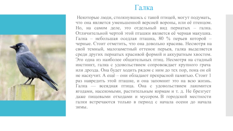 является уменьшенной версией вороны, или её птенцом. Но, на самом деле, это отдельный вид пернатых – галка. Отличительной чертой этой пташки является её черная макушка. Галка – небольшая оседлая пташка, 80 % перьев которой – черные. Стоит отметить, что она довольно красива. Несмотря на свой темный, малозаметный оттенок перьев, галка выделяется среди других пернатых красивой формой и аккуратным хвостом. Это одна из наиболее общительных птиц. Несмотря на стадный инстинкт, галка с удовольствием сопровождает крупного грача или дрозда. Она будет ходить рядом с ним до тех пор, пока он ей не наскучит. А ещё – они обладают прекрасной памятью. Стоит 1 раз навредить этой пташке, и она запомнит это на всю жизнь. Галка — всеядная птица. Она с удовольствием лакомится ягодами, насекомыми, растительным кормам и т. д. Не брезгует даже пищевыми отходами и мусором. В городской местности галки встречаются только в период с начала осени до начала зимы.
