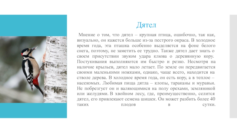 как, визуально, он кажется больше из-за пестрого окраса. В холодное время года, эта пташка особенно выделяется на фоне белого снега, поэтому, не заметить ее трудно. Также дятел дает знать о своем присутствии звуком удара клюва о деревянную кору. Постукивания выполняются им быстро и резко. Несмотря на наличие крыльев, дятел мало летает. По земле он передвигается своими маленькими ножками, однако, чаще всего, находится на стволе дерева. В холодное время года, он есть кору, а в теплое – насекомых. Любимая пища дятла – клопы, тараканы и муравьи. Не побрезгует он и валяющимися на полу орехами, земляникой или желудями. В хвойном лесу, где, преимущественно, селится дятел, его привлекают семена шишек. Он может разбить более 40 таких плодов в сутки.