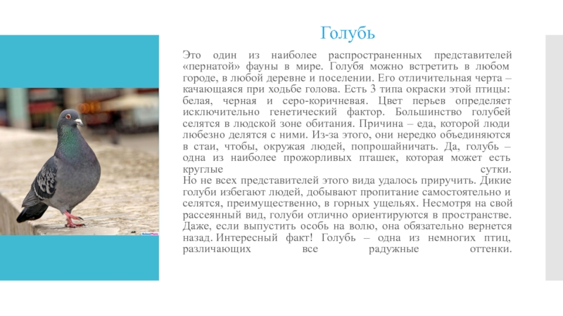 Это один из наиболее распространенных представителей «пернатой» фауны в мире. Голубя