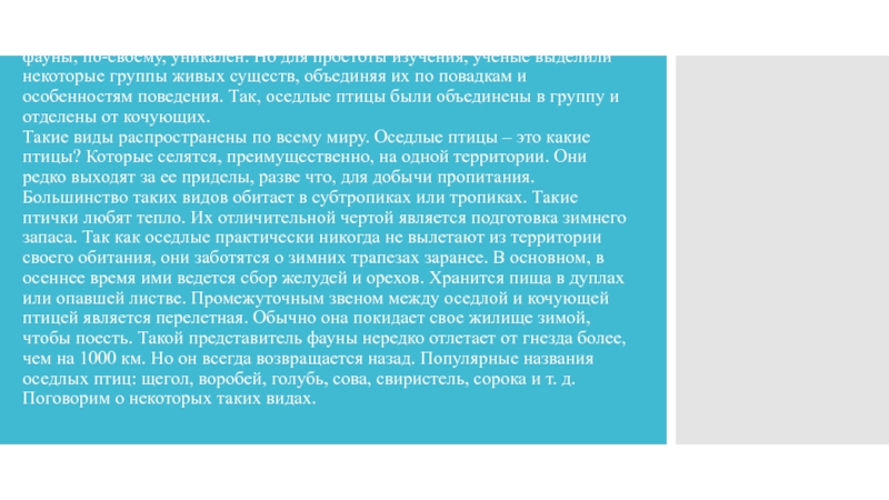 Но для простоты изучения, ученые выделили некоторые группы живых существ, объединяя их по повадкам и особенностям поведения. Так, оседлые птицы были объединены в группу и отделены от кочующих.