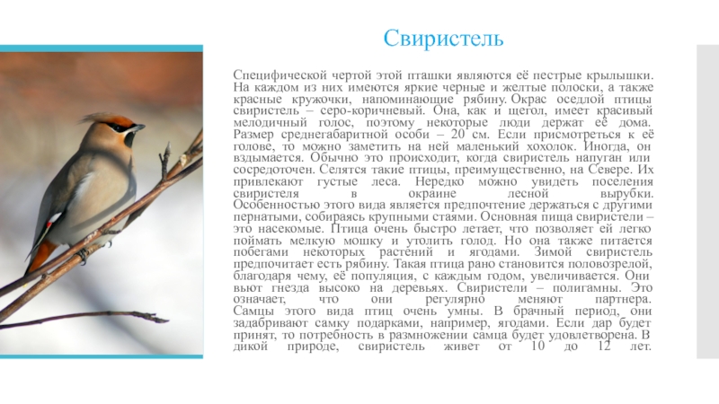 них имеются яркие черные и желтые полоски, а также красные кружочки, напоминающие рябину. Окрас оседлой птицы свиристель – серо-коричневый. Она, как и щегол, имеет красивый мелодичный голос, поэтому некоторые люди держат её дома.