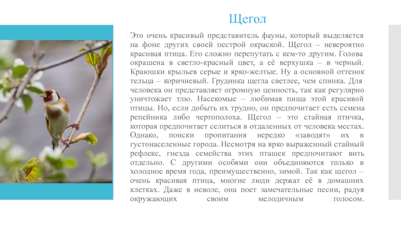 пестрой окраской. Щегол – невероятно красивая птица. Его сложно перепутать с кем-то другим. Голова окрашена в светло-красный цвет, а её верхушка – в черный. Краюшки крыльев серые и ярко-желтые. Ну а основной оттенок тельца – коричневый. Грудинка щегла светлее, чем спинка. Для человека он представляет огромную ценность, так как регулярно уничтожает тлю. Насекомые – любимая пища этой красивой птицы. Но, если добыть их трудно, он предпочитает есть семена репейника либо чертополоха. Щегол – это стайная птичка, которая предпочитает селиться в отдаленных от человека местах. Однако, поиски пропитания нередко «заводят» их в густонаселенные города. Несмотря на ярко выраженный стайный рефлекс, гнезда семейства этих пташек предпочитают вить отдельно. С другими особями они объединяются только в холодное время года, преимущественно, зимой. Так как щегол – очень красивая птица, многие люди держат её в домашних клетках. Даже в неволе, она поет замечательные песни, радуя окружающих своим мелодичным голосом.