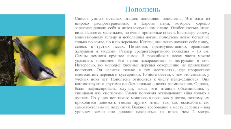 распространенных в Европе птиц, которые хорошо зарекомендовали себя в интеллектуальном плане. Особенностью этого вида являются маленькие, но очень проворные ножки. Благодаря своему миниатюрному тельцу и небольшим ногам, поползень ловко бегает не только по земле, но и по деревьям. Кстати, они легко находят себе пищу, селясь в густых лесах. Питаются, преимущественно, орешками, желудями и ягодами. Размер среднегабаритного поползня – 13 см. Самцы немного крупнее самок. В российских лесах часто можно услышать поползня. Его пение завораживает и погружает в сон. Интересно, но молодые хвойные деревья совершенно не привлекают поползня. Он селится только в тех местностях, где прорастают многолетние деревья и кустарники. Точного ответа, с чем это связано, у ученых пока нет. Поползень относится к числу птиц-одиночек. Они контактируют с другими особями только в целях размножения. Однако, были зафиксированы случаи, когда эти пташки объединялись с синицами или снегирями. Самки поползня откладывают яйца только в дуплах. Но у них нет такого мощного клюва, как у дятла, поэтому им приходится занимать гнезда других птиц, так как выдолбить его самостоятельно не получится. Важное требование к месту селения – над уровнем земли оно должно находиться не ниже, чем 2 метра.