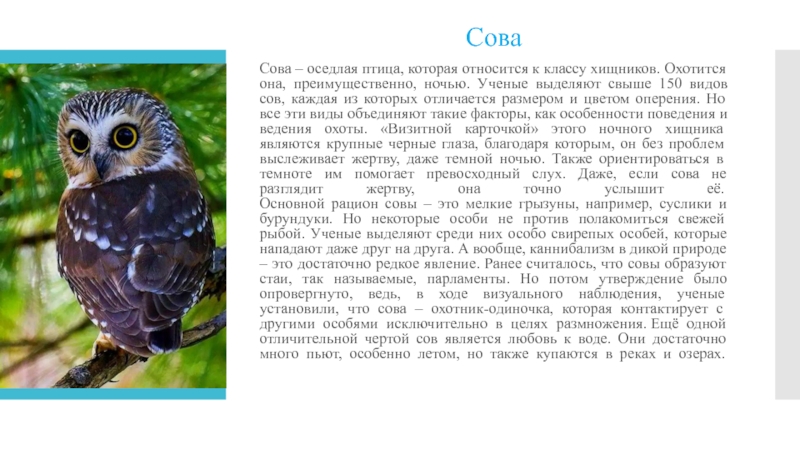 Сова – оседлая птица, которая относится к классу хищников. Охотится она,