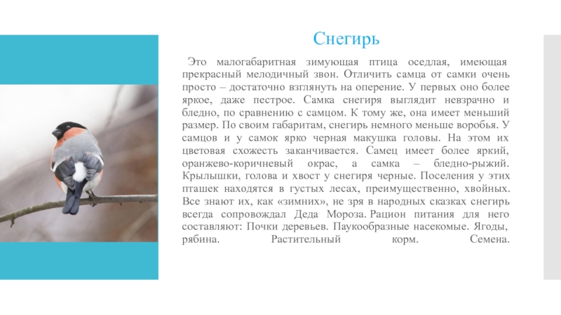 самца от самки очень просто – достаточно взглянуть на оперение. У первых оно более яркое, даже пестрое. Самка снегиря выглядит невзрачно и бледно, по сравнению с самцом. К тому же, она имеет меньший размер. По своим габаритам, снегирь немного меньше воробья. У самцов и у самок ярко черная макушка головы. На этом их цветовая схожесть заканчивается. Самец имеет более яркий, оранжево-коричневый окрас, а самка – бледно-рыжий. Крылышки, голова и хвост у снегиря черные. Поселения у этих пташек находятся в густых лесах, преимущественно, хвойных. Все знают их, как «зимних», не зря в народных сказках снегирь всегда сопровождал Деда Мороза. Рацион питания для него составляют: Почки деревьев. Паукообразные насекомые. Ягоды, рябина. Растительный корм. Семена.