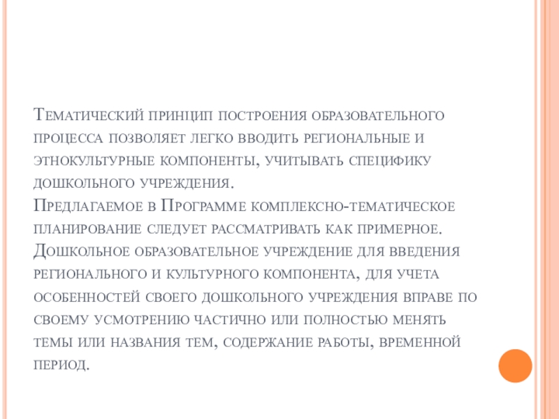 Тематический принцип построения образовательного процесса позволяет легко вводить региональные и этнокультурные компоненты, учитывать специфику дошкольного учреждения. Предлагаемое