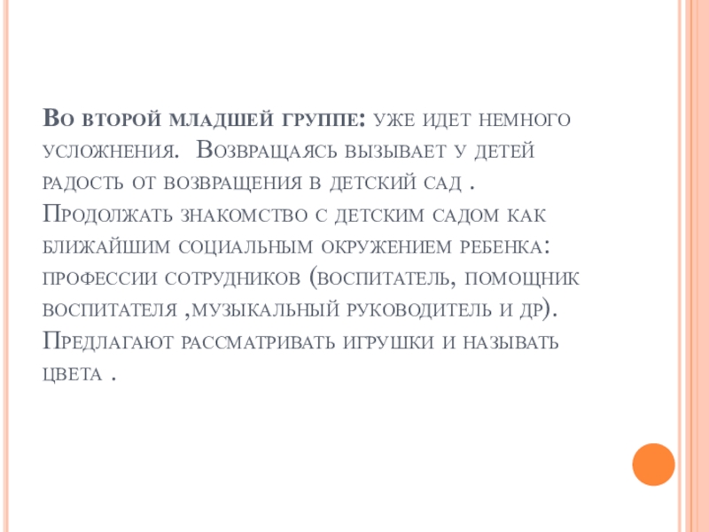 Слайд 5Во второй младшей группе: уже идет немного усложнения. Возвращаясь вызывает у