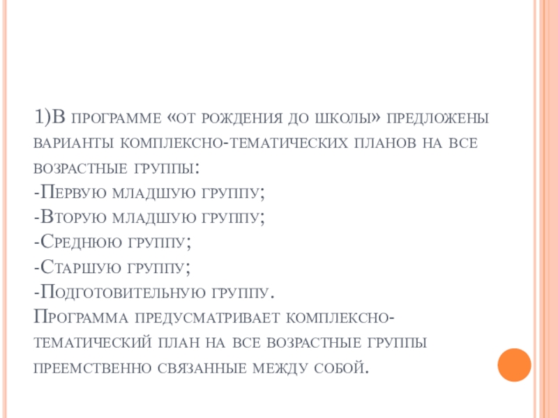 1)В программе «от рождения до школы» предложены варианты комплексно-тематических планов на все возрастные группы: -Первую младшую группу; -Вторую младшую группу; -Среднюю группу; -Старшую группу; -Подготовительную группу. Программа предусматривает комплексно-тематический план на все возрастные группы преемственно связанные