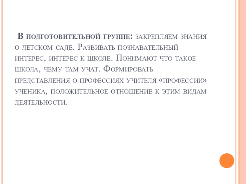 В подготовительной группе: закрепляем знания о детском саде. Развивать познавательный интерес, интерес к школе. Понимают что