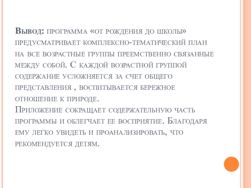 Слайд 9Вывод: программа «от рождения до школы» предусматривает комплексно-тематический план на все