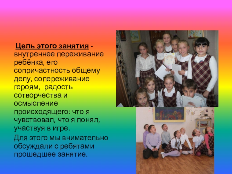 Слайд 16 Цель этого занятия - внутреннее переживание ребёнка, его сопричастность общему