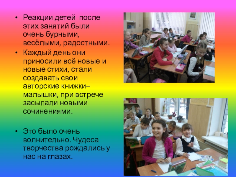 Слайд 19Реакции детей после этих занятий были очень бурными, весёлыми, радостными.