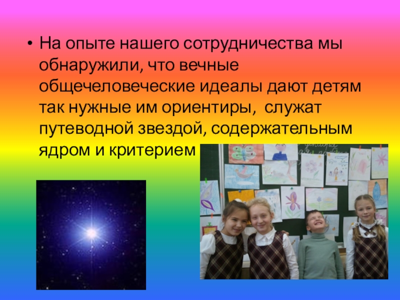 Слайд 41На опыте нашего сотрудничества мы обнаружили, что вечные общечеловеческие идеалы дают
