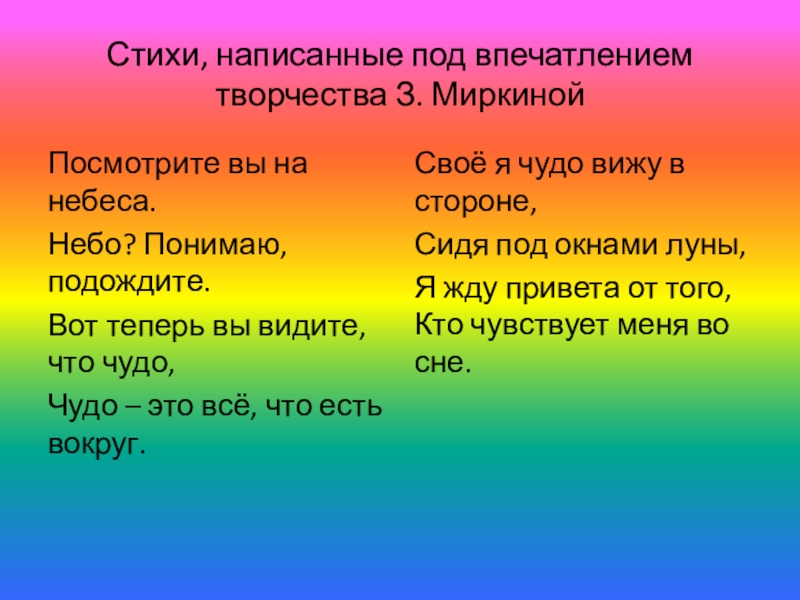 Слайд 35Стихи, написанные под впечатлением творчества З. Миркиной