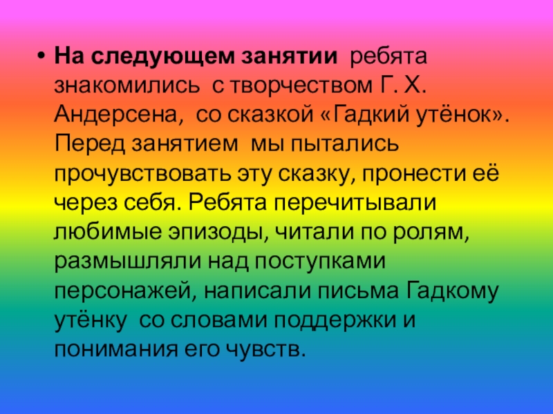 сказкой «Гадкий утёнок». Перед занятием мы пытались прочувствовать эту сказку, пронести её через себя. Ребята перечитывали любимые эпизоды, читали по ролям, размышляли над поступками персонажей, написали письма Гадкому утёнку со словами поддержки и понимания его чувств.