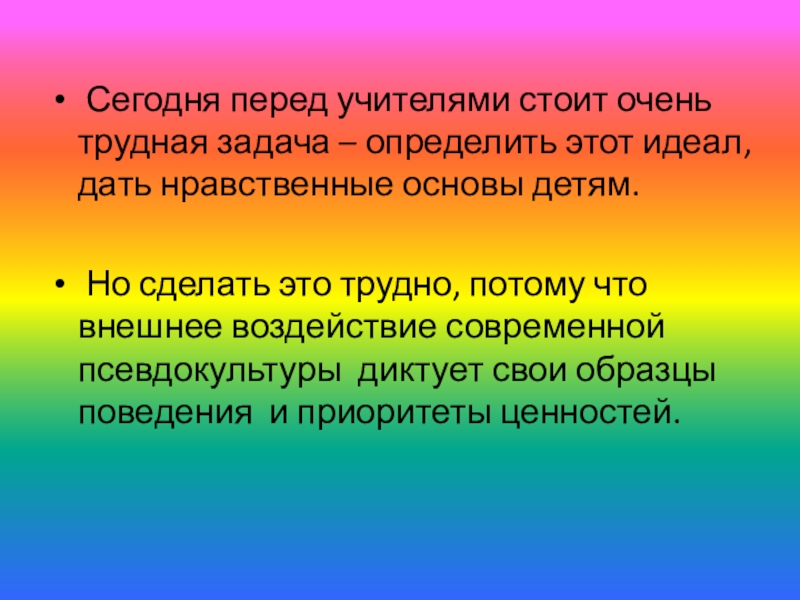 Но сделать это трудно, потому что внешнее воздействие современной псевдокультуры диктует свои образцы поведения и приоритеты ценностей.
